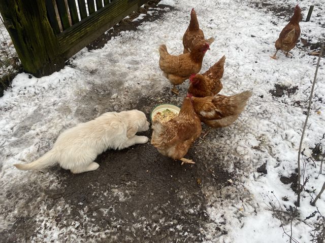 pup Linde bij onze kipjes kijken